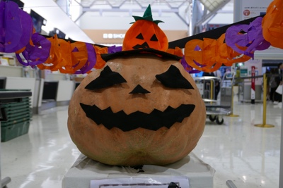 自宅を6時前に出発し、成田空港行きのバスに乗って第2ターミナルへ到着。ハロウィンの季節なので空港ロビーではハロウィンの飾りがボクたちを出迎えてくれた。荷物を預け、ラウンジでビールを1杯飲んでから搭乗口へ向かう。途中にある