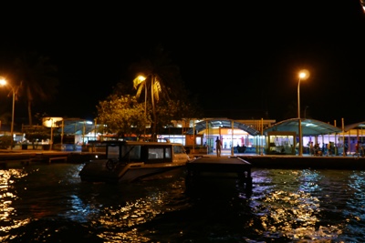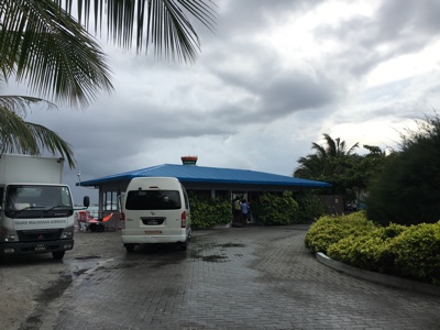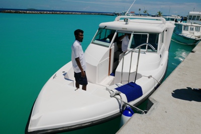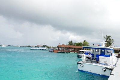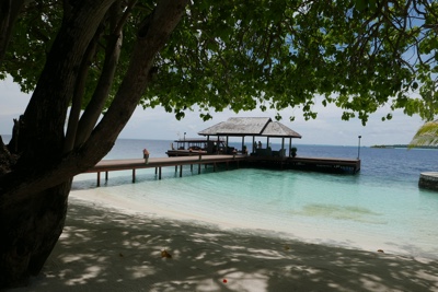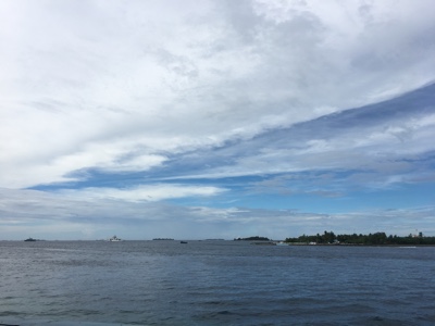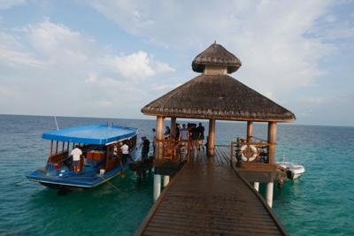荷物を受取り外に出たら旅行会社の女性が待っててくれた。ミニバンに他のお客さんと乗り込み、船着場に向かう。通り沿いの店などにも寄りたかったのだがその時間は無い。この空港の島から各リゾートにはスピードボートに乗って行く。港の海の色はとても綺麗だ。感動。さて、ボートに乗り込み出発だ!さすが「スピードボート」というだけあってかっ飛ばす。乗客はボクたち含めて3人だけだ。島々をぬけてリーティビーチリゾートを目指す。周りはとても素敵な景色だ。
