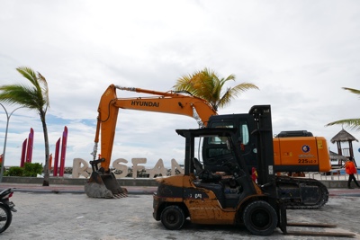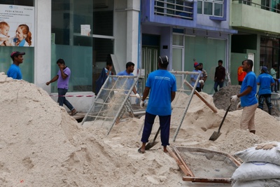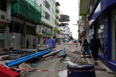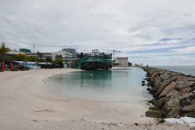 夕方はビーチ沿いを歩きながらサンセットバーまで行くことにした。ボクたちの泊まっている水上コテージの柱を修繕しているようだ。ご苦労様。
