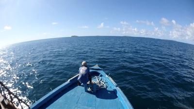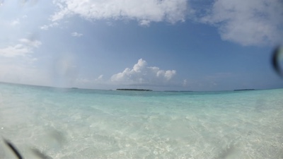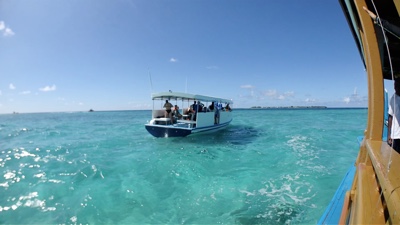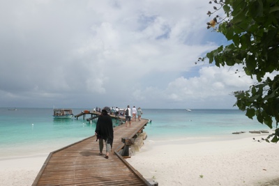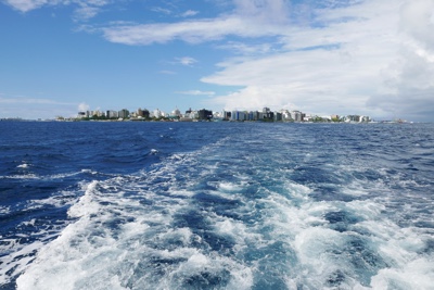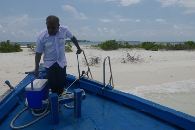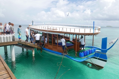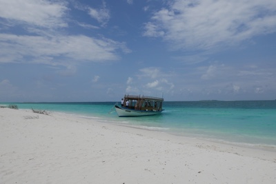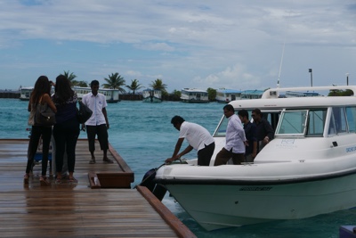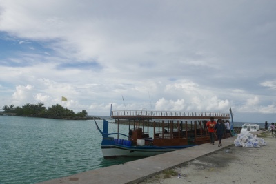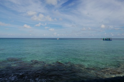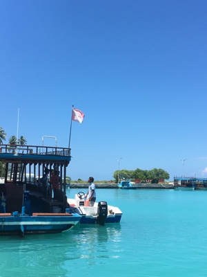 ダイビング器材を片付けた後は島に戻っての遅めのランチだ。ビールを飲みながら美味しい食事を頂く。そしてそのあとは「アイランドホッピング」のツアーに参加する。モデルディブは1島1リゾートで、リゾートにはリゾート関係者以外の現地の人たちは住んでいない。彼らが住んでいるのは「ローカルアイランド」と呼ばれていて、リゾート島の近くにいくつかある。そういう彼らの生活を見るローカルアイランド巡りが「アイランドホッピング」ツアーだ。再び桟橋からドーニーで出発だ。それにしても海の色が透明すぎる・・・。