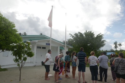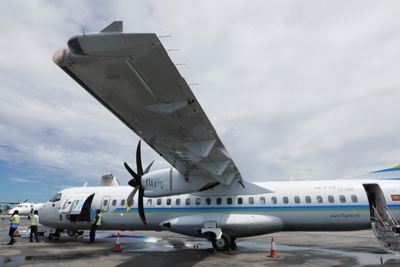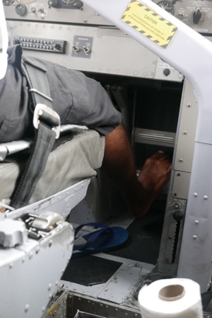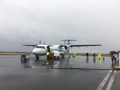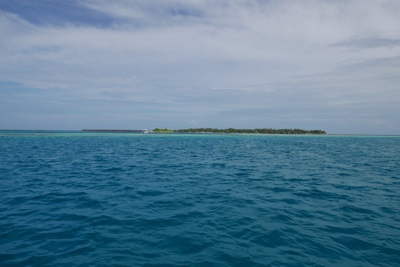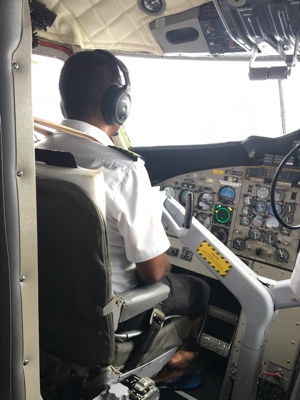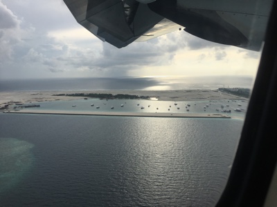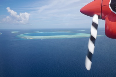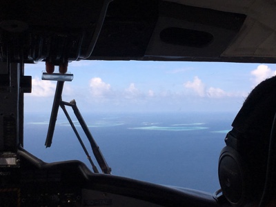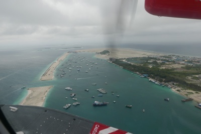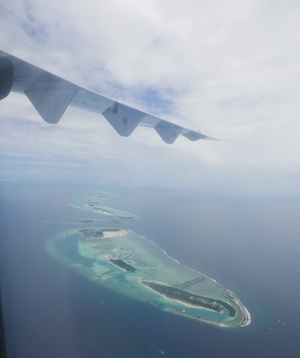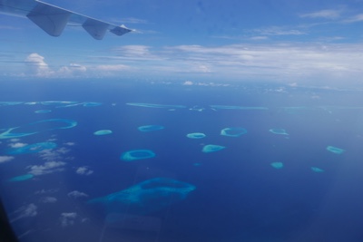 天気が良くなかったマレを飛び立った。ジェット機のような雲の上の高すぎる高度ではなく、景色の良い高度で飛んでいると薄暗かった海の色も鮮やかなエメラルドブルーになってきた。サンゴ礁に囲まれた小さな島がいくつも見えてくると心がワクワクしてくる。