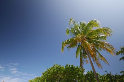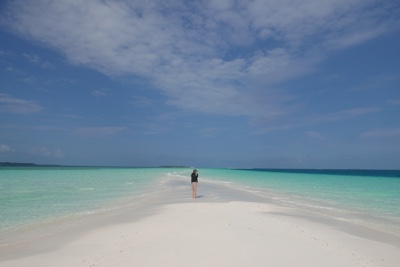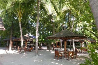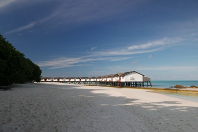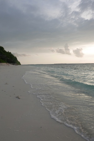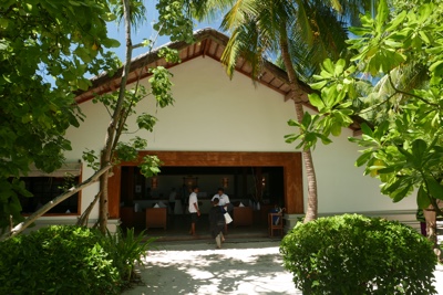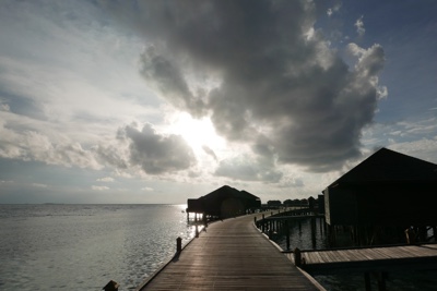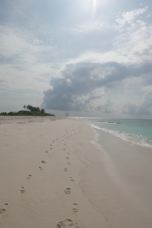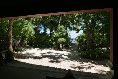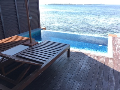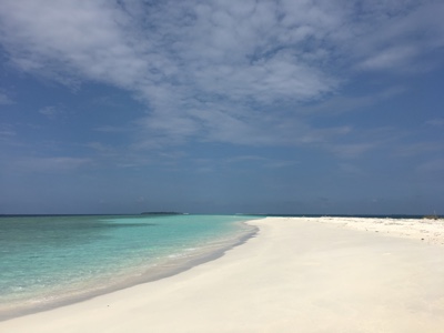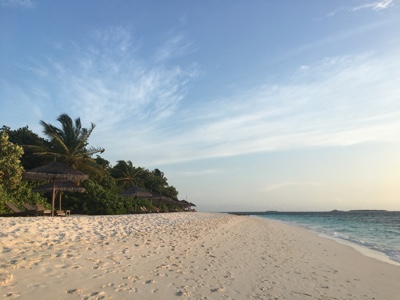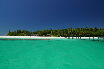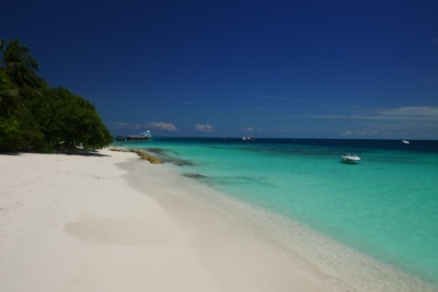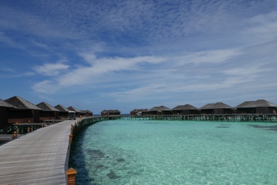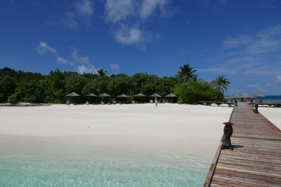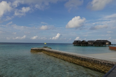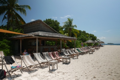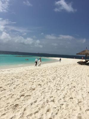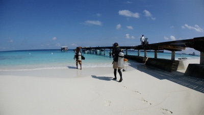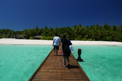 「何これ!」さすが「インド洋の真珠」と言われるだけあって、眼下に連なるモルディブの島々は美しい。海の濃い青色の周りにエメラルドブルーが散りばめられている。長い間ずっと来たかったモルディブのリゾートに来たのだとだんだん実感が湧いてくる。そしてバア環礁の空港のある島に着いた。飛行機から降りると日差しが強い。マレでは感じることのできなかった「南の島」の日差しだ。