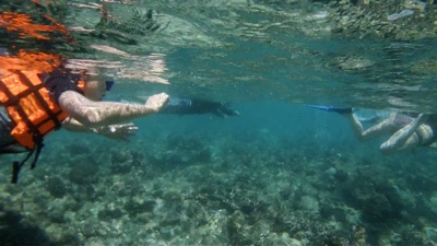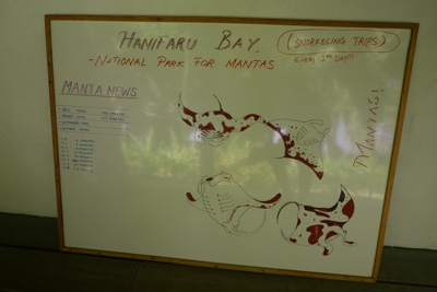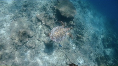 ガイドが何箇所かマンタポイントを潜って探したが、この日は1匹も姿を現せなかった。ぐるぐるマンタの時期も終わりに近づいている。客たちは皆残念そうにしていたが仕方ない。ボクも海の中ではマンタを見たことがないのでぜひ見たかった。仕方がないので別のリーフポイントでシュノーケリングをすることに。ボクはダイビングはするけれど、ビギナーだしカナヅチだ。「ライフジャケットを貸して」とクルーに頼み、ライフジャケットを着て海の中にドボンする。海中に潜るより海面を浮かんでいる方が怖い。軽いパニック気味だ・・・。そして結構泳がされる。途中、ウミガメも見たが大物を見ることは出来なかった。