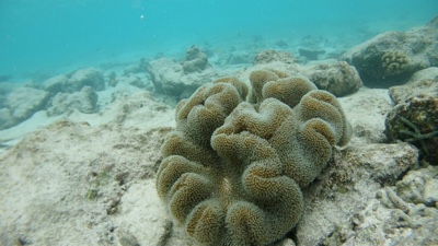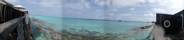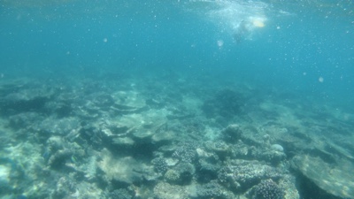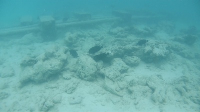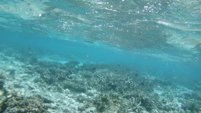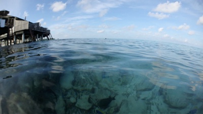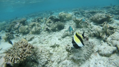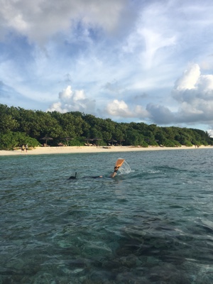 ビーチ沿いにシュノーケリングをしながら少しずつ水上ヴィラに戻る。水上ヴィラ近辺はゴツゴツした岩場や死んだ珊瑚がたくさんあるが、ミネラルが豊富なのか魚が多い。水上ヴィラの真下にも結構大きな魚がたくさんいる。たくさん泳いでいったん部屋に戻ることにした。ハウスリーフ楽しい。