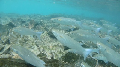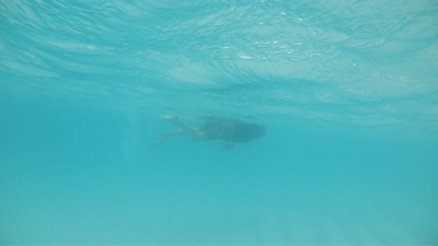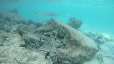 波が高くて小雨が降り出したので島の逆側に移動した。桟橋側の方だ。こちら側の波は高くはないけれど水は濁っている。魚もチラホラ見かけるようになり、小さなサメもいた。