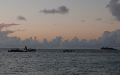 太陽がだんだんオレンジ色になってきた。そして近くに見慣れない島が見えてきた。モルディブの島は高い建物がないし、1島1リゾートなので遠くから見たらどの島か分からない。近づいてみると、新しいコテージを建設中の新しいリゾートのようだ。どんなリゾートになるのか楽しみだね。