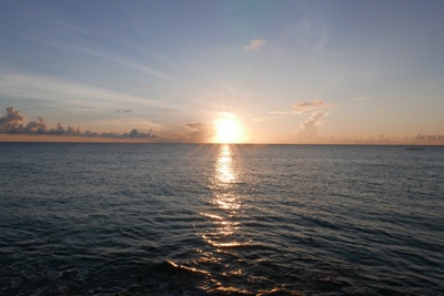 明け方、波の音で目がさめる。テラスに出てみると穏やかな海が広がっている。小さな水上飛行機が降り立った。今日この島に来た客なのだろう。水平線の向こうから太陽が登るのを眺め、今日の1日がはじまるのをワクワクする。