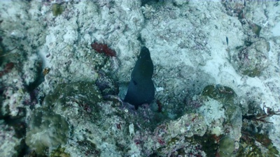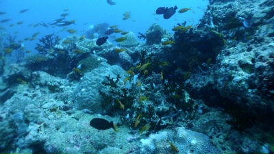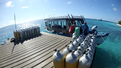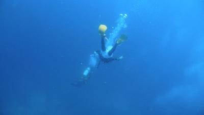 1本めは「MAA NAGU」というマンタポイントだそうだ。マスクに曇り止めを塗りフィンを履き、タンクを背負っていよいよボートエントリー。マスクを抑えてドボン。すぐにBCに少し空気を入れて浮力を確保する。続いて嫁ちゃんもエントリー。イリーの合図でBCの空気を抜きだんだんと潜行していく。底は見えるけれどちょっと怖い。ゆっくり呼吸をしながらだんだん潜っていく。とにかくパニックになってはダメだ。落ち着いて、海底の景色を楽しみながら進んでいく。小さな魚はたくさんいる。とても綺麗だ。珊瑚のそばを空中遊泳するような感じで浮遊するのがとても楽しい。残圧が50を切ったところでそろそろ帰り仕度だ。
