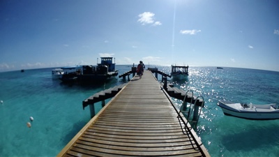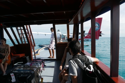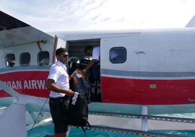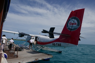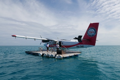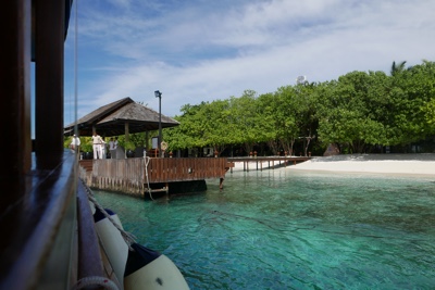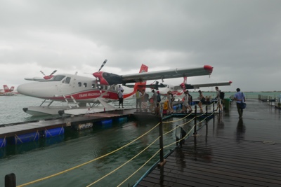 着陸体制、いや着水体制に入りだんだん海面が近づいて来る。水上飛行機はス〜と着水し、サンゴ礁に囲まれた海の上に浮く桟橋に横付けされた。そして飛行機を降り、ドーニーに乗り換える。