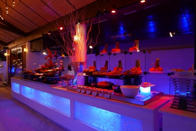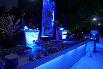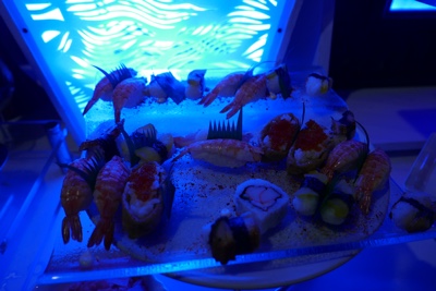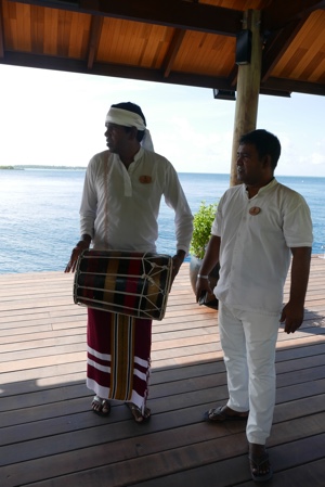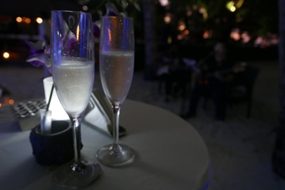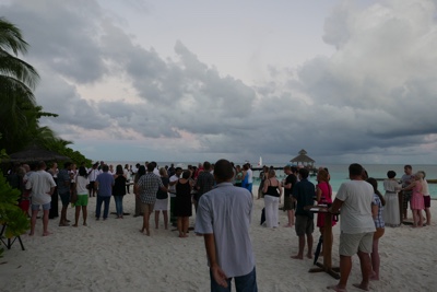 水上ヴィラの島の反対側のビーチで「マネージメントカクテル」というのをやっていたので参加してみた。音楽の生演奏とシャンパン、寿司など軽い食事で客をもてなすイベントのようだ。日中あれだけいたアジアの人達は誰もいなくボクたちだけだった。