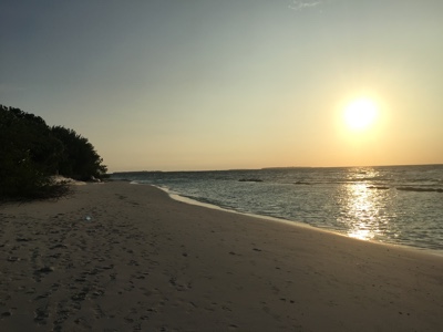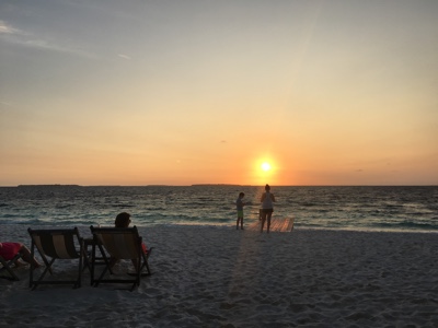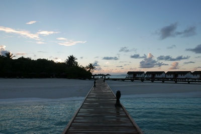 カクテルを呑んでほろ酔い気分のボクと嫁ちゃんは夕日を見にサンセットバーに行くことにした。日中シュノーケルをしていたのと反対側の海沿いを水上ヴィラから歩く。誰かが作った砂の城があったり、ヤドカリがチョコチョコと歩いたりしていた。次にこの島に来るときには、こちら側のビーチコテージもいいかもしれない。