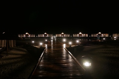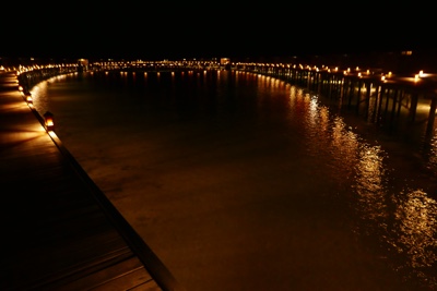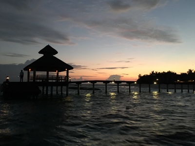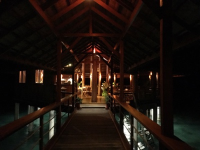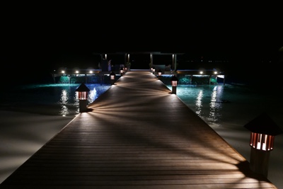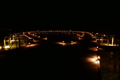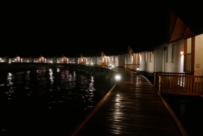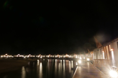 水上ヴィラに戻る桟橋や水中もライトアップされていて綺麗だ。空にも満点の星がある。ホント贅沢な時間を過ごしているな・・・。
