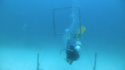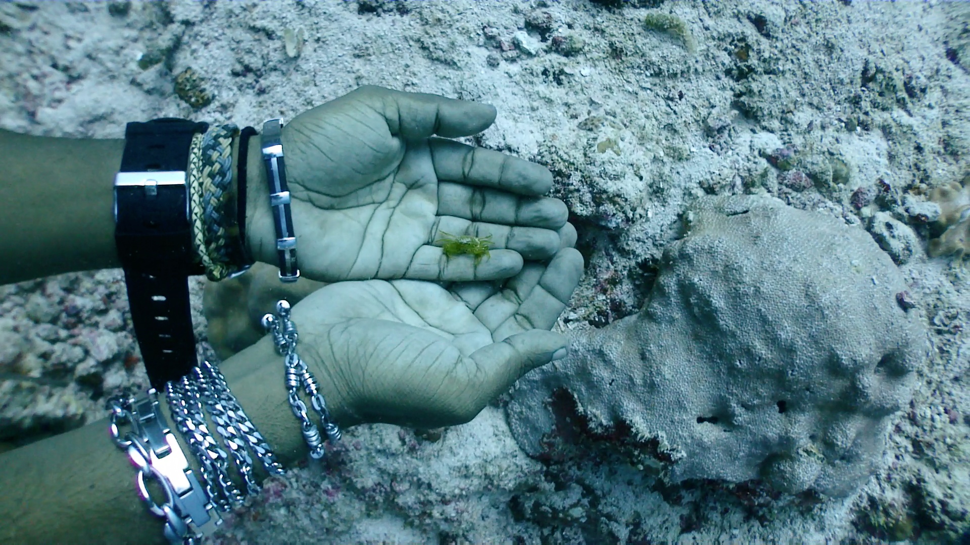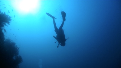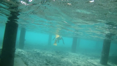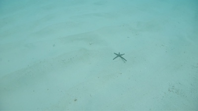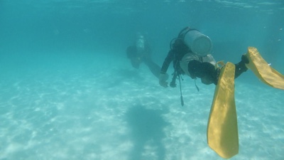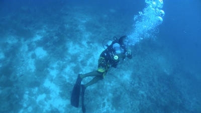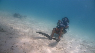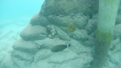 今日のダイビングは、旅行前に買った水中カメラを持って入る。桟橋の横をタンクを担いでエントリーし、橋脚の下を潜ってだんだん潜行していく。珊瑚がたくさんあるわけではないけれど白い砂が美しい。少しずつ深くなって行くと突然水中カメラの液晶が「ビビビッ」といって映らなくなった。なんだよぉ〜〜〜!買ったばかりの新品で30m防水だぞ!