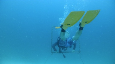 ドーニーに乗り込み、島に戻る。ランチを食べて今度はリフレッシュダイビングだ。ボクも嫁ちゃんもダイビングは10年ぶりくらいだ。ガイドのイリーに「ボクたちはビギナーでブランクダイバーだよ」と念を押し、丁寧に教えてもらう。そしていよいよビーチエントリー。水中カメラを持って入りたかったけれど