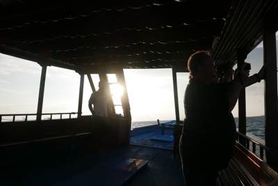 夕方、サンセットクルーズ(サンセットドーニー)に出かけた。桟橋を歩いてドーニーに乗り込む。先ほどまで少しスコールが降っていたので傘を持っている人もいる。夕日に向かって島を出ると、ヨットを撮影しているクルーがいた。プロモーション映像の撮影か何かなのかな。