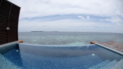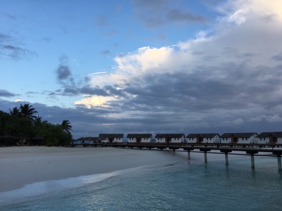 夕方になってきたけれどせっかくなので水上ヴィラのそばでシュノーケリングをする。今回の旅行の前にフィンとマスクを新調したのだ。奮発して水中カメラも買った。エントリーしてみると、水上ヴィラの周りは珊瑚が白化している。ハウスリーフに期待していたのにちょっと残念。大きな魚やイソギンチャクなどを眺めていたら遠くにサメを発見!ビビってしまい、ちょっと沖で泳いでいた嫁ちゃんもパニックにならないように出来る限りの笑顔でこっちに呼び戻した。よく考えると1m足らずの赤ちゃんサメだったのだけれどね。