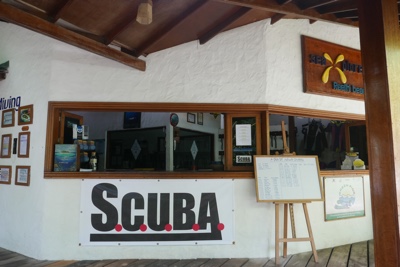 ビーチを少し歩いた後、ロビーのバーでビールを飲む。その後 ダイビングセンターに行き明日のチェックダイブを予約した。自分たちは「ビギナー&ブランクダイバー」だということを伝えて、機材の準備と説明を受けた。