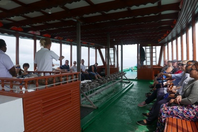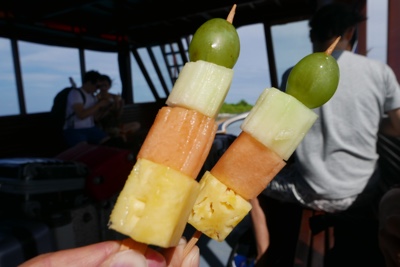 ドーニーの中で飲み物と果物が配られた。それを食べながら島が近づいてくるのを眺めている。
