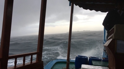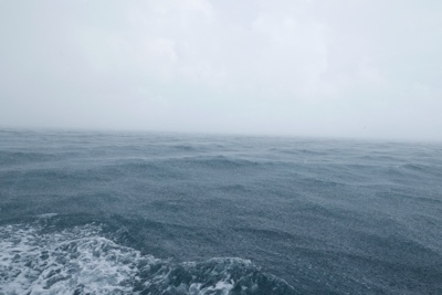 ドーニーに乗り込み海を進んでいると、遠くの方の空が暗くなってきた。どんどん雲が広がり、しまいには大雨と濃霧と嵐。ドーニーも揺れまくっていたけれどボクたちは船酔いしないので大丈夫だ。