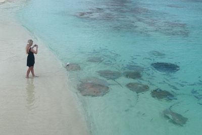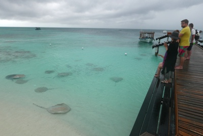 リーティに戻る途中もまたすごい雨が降ってくる。海が荒れている中で漁をしているモルディブの漁師たちがいた。桟橋まで戻ると浜にたくさんの人だかりがあった。何かと思って見てみると餌付けをしていてエイや魚たちがよってきていた。すごいたくさんの数だ。餌付けの時間を覚えていて毎日浜にくるらしい。