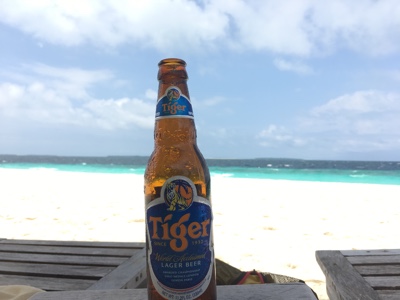 朝食のあとはビーチに泳ぎに行くことにした。だがその前にサンセットバーでTigerビールを飲む。ビーチチェアーに腰掛けていると、タキシードとウエディングドレスを着たカップルが歩いている。その前にカメラマンもいる。ハネムーンでくる人が多いせいか、リーティビーチリゾート内のいたるところで写真を撮るサービスがあるらしい。新郎は神父のドレスの裾を持ち、汗だくになりながら歩いていた。ボクたちもやればよかったかな・・・。