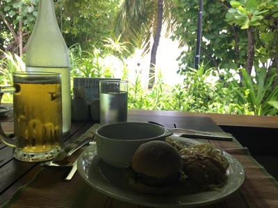 今日も朝から日差しが強い。ダイビングは午後からなので午前中はのんびり出来る。メインレストランの外でWifi繋いで仕事メールをいくつかこなす。まだ誰も使ってないのでまぁまぁ速い。
