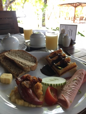 昨晩はボートダイビングへの不安でなかなか眠れなかった。10年ぶりなので不安が次々頭の中をよぎってくる。あまり眠れないので薄暗いうちに起きてネットが繋がるメインレストランのそばで少し仕事をした。7:30にレストランが開いたのでちょっとだけ食べる。