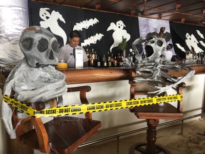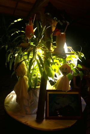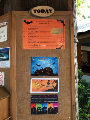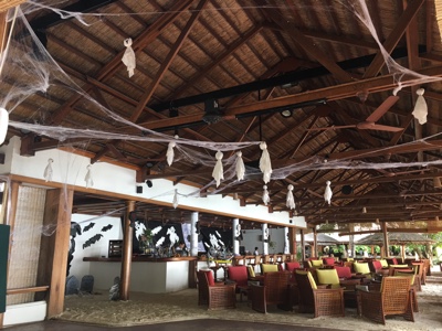 3時間後ボートが迎えにきてくれた。無人島で2人きり、結構満喫した。リーティに戻ってメインバーでビールを飲む。今晩のハロウィンパーティのためにスタッフがハロウィンの飾り付けをしている。