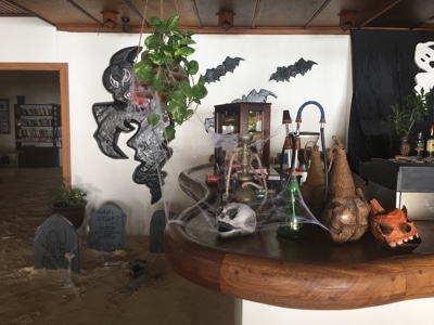 メインバーでハロウィンの飾り付けをしている。この手作り感がなんかいいな。