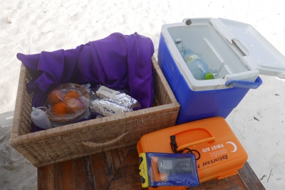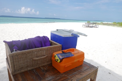ドーニーに乗ってほどなく無人島に到着した。島にはベンチとテーブルが置いてあり、ドーニーを降りるときに昼食と飲み物、そして緊急用の携帯電話を渡される。ボクたちと荷物を降ろしたあとはドーニーは去って行くのだ。まさしく無人島にはボクたち2人だけが残されたのだ。