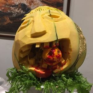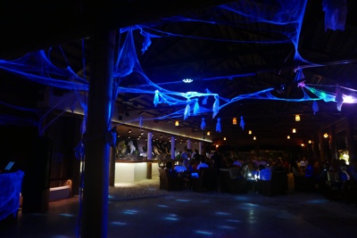 明日は次の「リリーリゾートアイランド」に行く。移動の予定を聞くためにレセプションセンターに行くと「20:30まで待ってくれ」と言われ先にディナーに行くことにした。途中にあるメインバーの前を通ると、ハロウィンの飾りの中、すでにお酒を呑んで楽しんでいる人たちがたくさんいた。