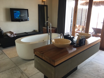 部屋に戻ってバスタブにお湯を入れると、とても濁っている。島なので水環境は良くないだろうし、雨水がメインなのだろうから、今日の午後からの大雨の影響なのだろう。