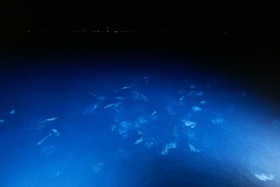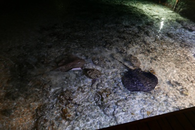夜の決まった時間に餌付けをしているらしく桟橋まで見に行ってみた。みるみるうちに大きな魚や小さなサメ、アカエイなどが集まって来た。餌を食べる様子は迫力があった。