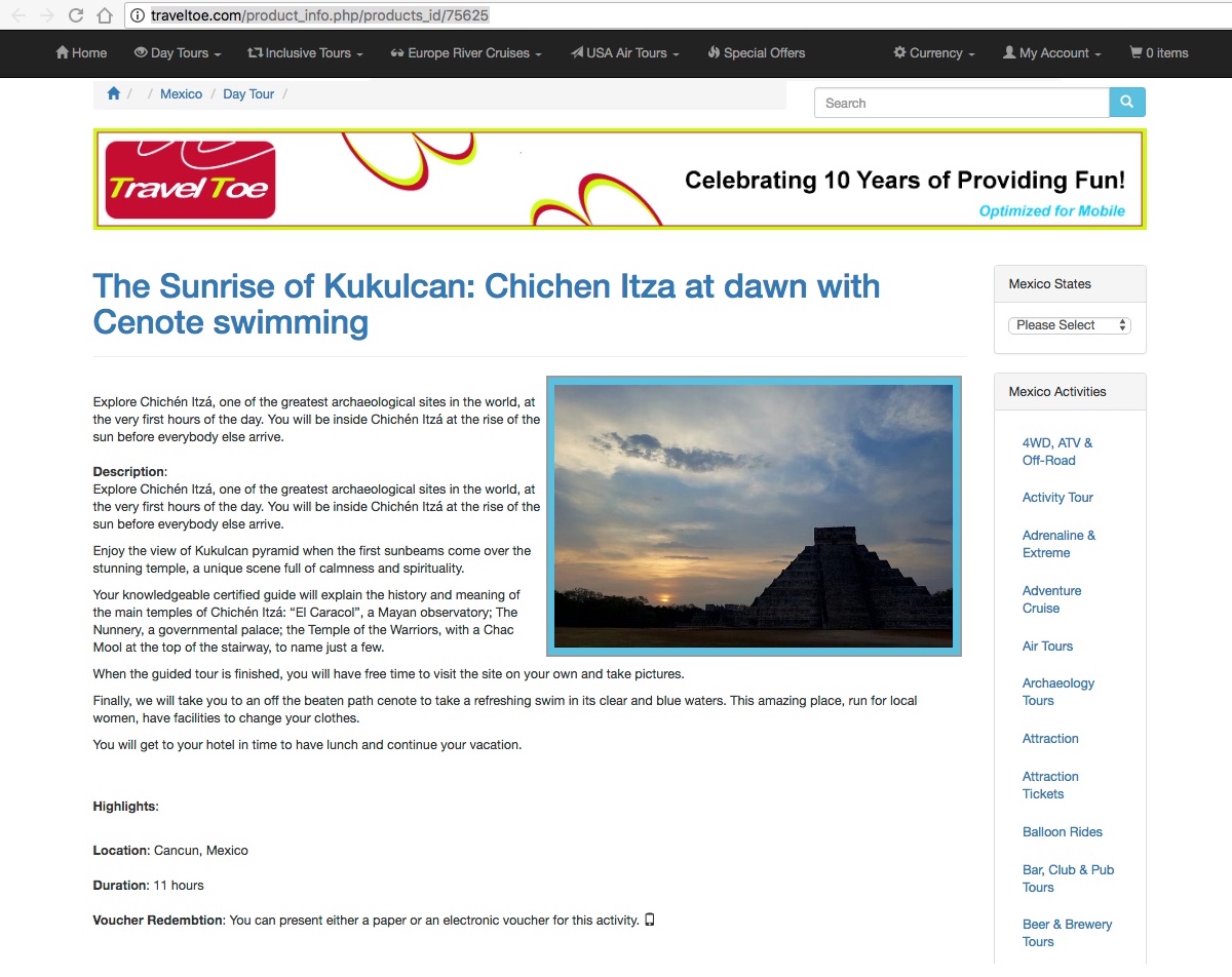 ネットでいろいろ調べると「Travel Toe」という会社がやっている「チチェン・イッツアの朝日とセノーテスイミング」というのを見つけた。