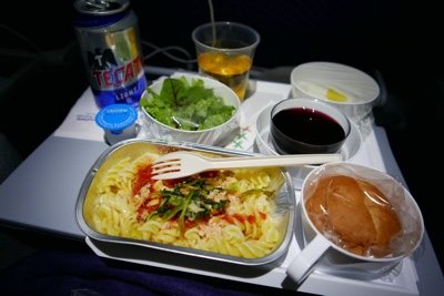 その30分後くらいにパスタとパンの軽食だ。CAのお兄さんが「このパスタは美味しいよ~」と腕の力こぶを作ってジェスチャーで言ってきた。ビール以外にも赤ワインも飲んでみる。そしてだんだん酔っ払ってくる。