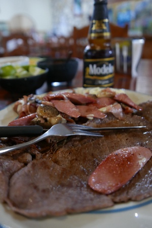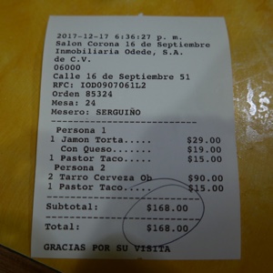 ボクはお酒が好きだ。メキシコと言えばテキーラが有名だけれど、メキシコでビールと言えばコロナビールだろう。もちろん他のビールも種類がたくさんあるのだろうけれども、日本で有名なメキシコのビールはコロナビールだ。そこで、生のコロナビールが飲めるお店「サロン・コロナ(Salón Corona)」に行ってみた。そしてタコスとコロナの黒生ビールを注文。美味かった〜。ボクたちは少食なのですぐにお会計。168メキシコペソ。1000円くらいかな。
