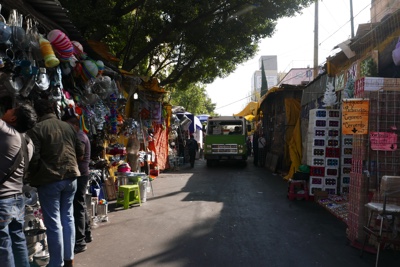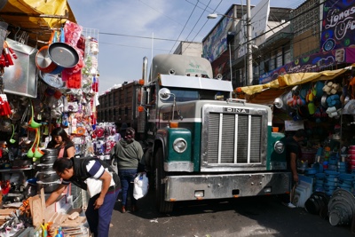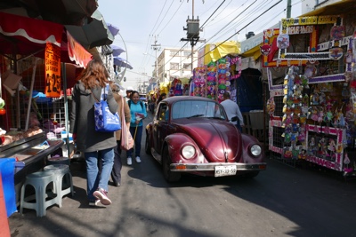 市場の外側にもたくさんの店がある。細い路地にも車が行き来する。メキシコではビートルをよく見るな。