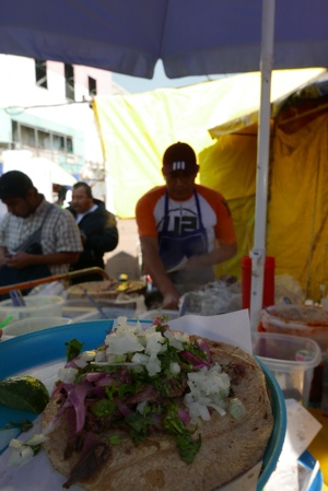 たくさんの人が集まっている屋台があった。覗いて見るとやっぱりタコスだ。こんなにたくさん集まっているのだからきっと美味いのだろう。1つ食べてみることにする。15ペソ。美味いな。