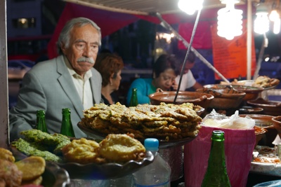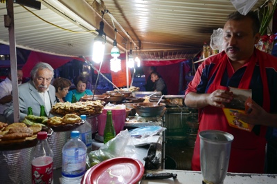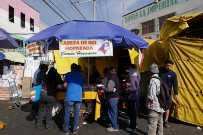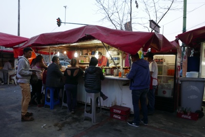 Arena Méxicoに行く途中に地元の人で賑わっていた屋台を発見。まだ時間があるし、ココで軽く何か食べるかな。ボクたちは海外に行くといろいろなものを食べてみたいので、いろいろな屋台やいろいろなお店で少しずついろいろものを食べるのだ。それがとても楽しい。