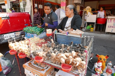 ヒヨコがショッピングカートの中に無造作に入れられている。そしてそのすぐそばには精肉店がある。
