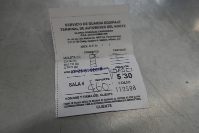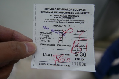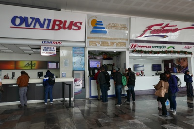 バスターミナルの中は結構広い。ボクたちは今からテオティワカンに行くバスに乗るのだ。今夜はテオティワカンのそばのホテルに1泊するため、1泊ぶんの荷物だけ小さいバックに小分けし、大きなバックパックは荷物預かり所に預けることにした。バスターミナルの通常の荷物預かり所は改装中だか工事中で閉まっており、かわりに奥に仮設の預かり所があった。ボクたちのバックパックは2つで1日60ペソで預かってくれるそうだ。支払いは翌日に取りにきた時でいいらしい。これで今日の遺跡巡りは重い荷物から解放されて楽チンになるだろう。
