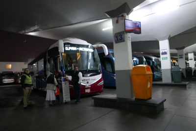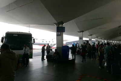 PUERTA1でメキシコシティ行きのバスを待つがまったく来ない。そこにいた警察官やメキシコ人に「メキシコシティ行きのバスはここで待ってればいいの?」と聞いたら「ここでいいよ。20分でくるよ。」というので待っていても全然来ず・・・。1時間ほど待ってやっとメキシコシティ行きのバスが到着した。