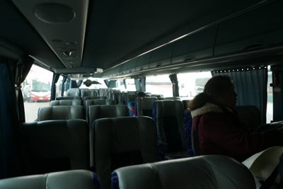 早朝で寒いので昨日と同じくありったけの服を重ね着した防寒仕様だ。ロビーで待っていると6:35にピックアップが来て車に乗って移動する。