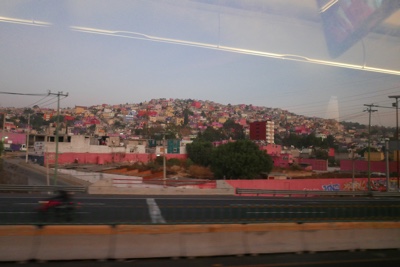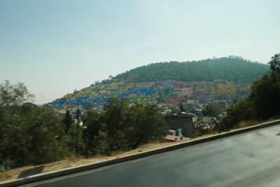 高速道路を走り、車窓を眺めているとブラジルのファベーラのように山頂を目指して建物が山肌を覆い尽くすエリアにいくつも出会った。ブラジルと比べ、メキシコの建物はよりカラフルで可愛かった。