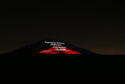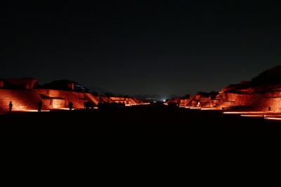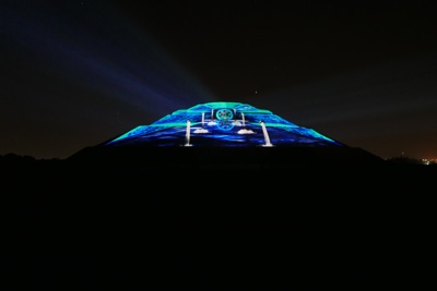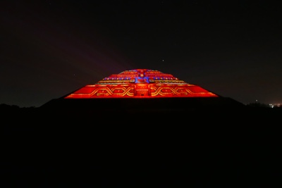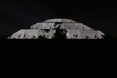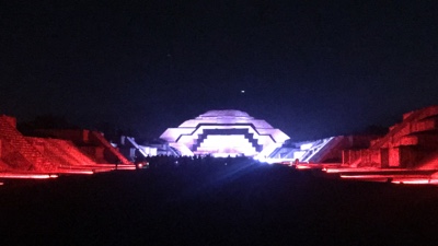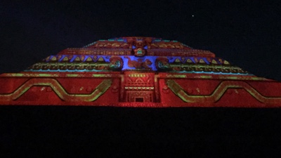 月のピラミッドへプロジェクションマッピングがはじまった。こんな巨大なピラミッドへのプロジェクションマッピングなんて見たことない。すごい光量だ。メキシコの古代文化のストーリーが音と光で紹介された。