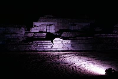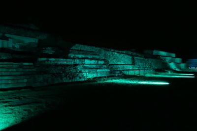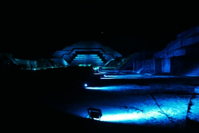 夜の遺跡にipodをかざしてみると過去の時代が見えるARなども体験できる。月のピラミッドはいろいろな色でライティングされておりとても綺麗だ。