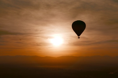 東の空を見ると、登ったばかりの朝日をバックに他の気球がシルエットに写ってなんとも幻想的だ。