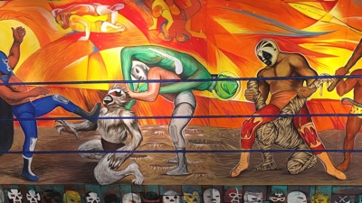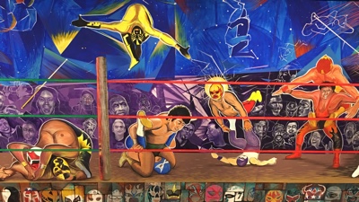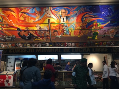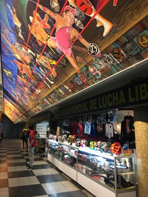 中に入るとシネコンのように食べ物や飲み物を売っている場所がある。そこにも覆面マスクを売っているし、何よりもルチャ・リブレの絵がアジがあって素敵だ。