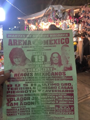今日の対戦のパンフレットをもらった。猪木が全盛期だったころTVでよくプロレスを見ていたけれど今はさっぱり分からない。ましてメキシコ人のプロレスラーもまったく知らない。パンフレットを見ると日本人も出ているみたいだし、今日は雰囲気を楽しみたいだけなのでプロレスラーを知らなくてもきっと楽しいだろう。