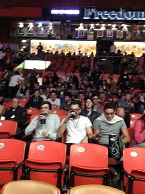 会場に入る前に売店のあたりでウロチョロしてたら「チケット見せて。ん〜、席はこっちだな。ついてきな。」みたいな感じでオジさんがボクたちを席まで連れて行ってくれた。「この人親切だなぁ。」と思っていたらチップを要求された。正式な仕事がどうか分からないけれど席の案内係だったのだろうか。そして「ビール飲むだろ。買ってくるよ。」と言われビールを買わされた。2杯で160ペソ。ちょっと高い気がするが乗せられてみるのも結構楽しい。